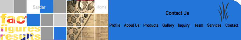 SARDAR INTERNATIONAL A/9, S.I.T.E MANGHOPIR ROAD, KARACHI. PAKSITAN. PH: 92-021-2574886 FAX: 92-021-2567535 E-MAIL: sardarint@cyber.net.pk E-MAIL: info@sardarint.com Contact Persons: MR. JAFAR ALI, DIRECTOR, MOBIL: #92 300-8205313 MR. SHAHID HUSSAIN, DIRECTOR, MOBIL: # 92 300-2246937 |